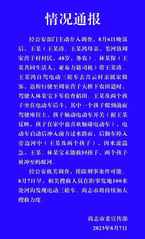 【误按电动车开关 5岁双胞胎坠河失联】8月7日晚,黑龙江尚志市委宣传部就“一对5岁双胞胎坠河失联”事件发布《情况通报》:经公安部门主动介入调查,8月6日晚饭后,王某(王某涛、王某鸿母亲,苇河镇周家营子村村民,48岁,务农)、林某保(王某共同生活人,亚布力籍司机)带王某涛、王某鸿自驾电动三轮车去青云村亲属家做客,返程行驶至周家营子大桥下农田道时,驾驶人林某宝下车检查稻田。王某及两个孩子坐在电动车后斗,其中一个孩子爬到前面驾驶座位上,孩子触动电动车开关(据王某反映,孩子在家中也喜欢触碰电动车),电动车启动后冲入前方过水路面,后翻车掉入旁边河中(王某及两个孩子),因水流湍急,王某、林某宝未能救回孩子,两个孩子被冲至蚂蚁河。
