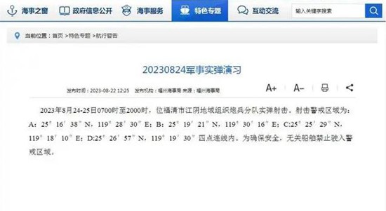 【福州将有炮兵分队实弹射击】福州海事局发布航行警告,8月24-25日7时至20时,位于福州福清市江阴地域组织炮兵分队实弹射击。射击警戒区域为:A:25°16′38″N,119°28′30″E;B:25°19′21″N,119°30′16″E;C:25°25′29″N,119°18′10″E;D:25°26′57″N,119°19′30″E四点连线内。为确保安全,无关船舶禁止驶入警戒区域。
