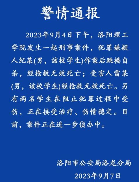 据通报显示,2023年9月4日下午,洛阳理工学院发生一起刑事案件,犯罪嫌疑人纪某(男,该校学生)作案后跳楼自杀,经抢救无效死亡;受害人雷某(男,该校学生)经抢救无效死亡。另有两名学生在阻止犯罪过程中受伤,正在接受治疗、伤情稳定。目前,案件正在进一步侦办中。(朱金博)