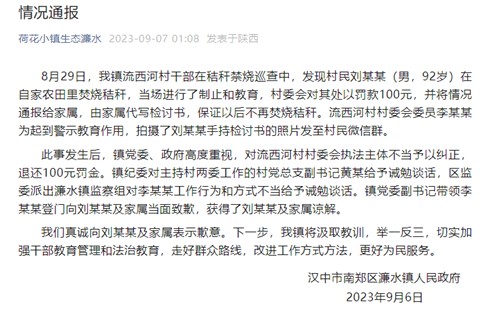 通报中表示,8月29日,濂水镇流西河村干部在秸秆禁烧巡查中,发现村民刘某某(男,92岁)在自家农田里焚烧秸秆,当场进行了制止和教育,村委会对其处以罚款100元,并将情况通报给家属,由家属代写检讨书,保证以后不再焚烧秸秆。流西河村村委会委员李某某为起到警示教育作用,拍摄了刘某某手持检讨书的照片发至村民微信群。