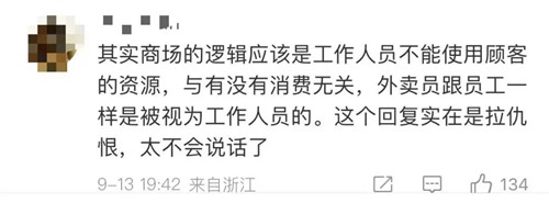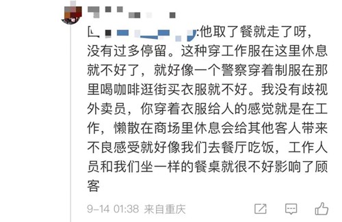 穿了工作服的外卖骑手不能在商场公区休息。对于这样的规定,不少网友表示不理解。