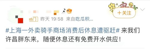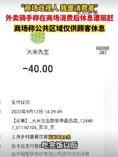 【上海外卖骑手商场消费后休息遭驱赶】9月12日,一名上海外卖骑手的视频引发了大家的关注。这名骑手表示,自己在静安寺一家购物广场吃完饭后,在公共区域休息,结果遭到了商场保安的驱赶。