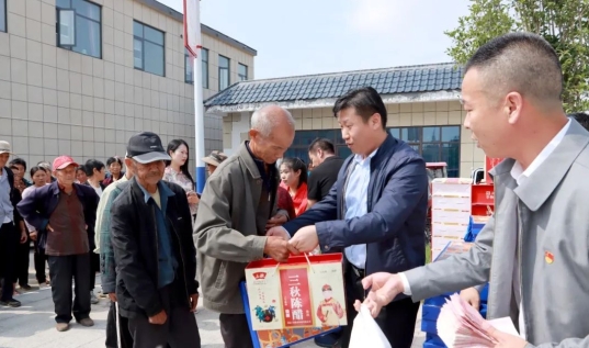 秋风送爽,丹桂飘香。9月27日,河南省驻马店市驿城区水屯镇关帝庙村开展“迎中秋庆国庆”慰问送温情活动。该村党支部书记张新四为困难群众送去米、面、醋、月饼及慰问金。
