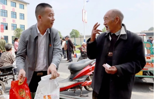 在村委大院,张新四向困难群众逐一发放慰问品和慰问金。“当干部就要抱着吃亏的态度为群众办实事、办好事,心里要时刻想着群众,不能和群众争好处。”张新四语言朴实、态度诚恳,感动了在场群众。