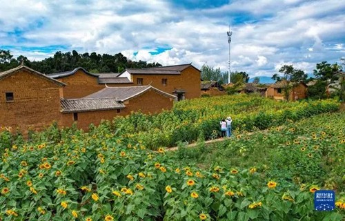 10月3日,游客在位于云南省昆明市滇池边的卧龙古渔村内游览拍照(无人机照片)。