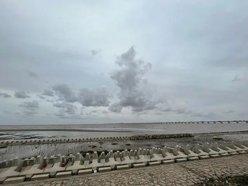 在大坝中央,经工作人员告知,澎湃新闻记者看到4岁女童消失的现场。事实上,大坝外,还有一道消浪坝,女童消失的滩涂位于消浪坝外的野滩涂。退潮时,滩涂裸露,除泥沙地外,能看到水草,成群的水鸟也来觅食,但滩涂外没有任何防护。