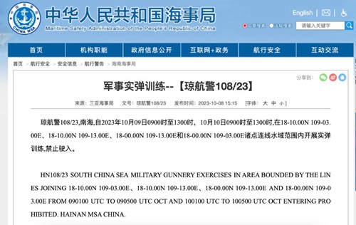 【南海部分海域开展实弹训练】据中国海事局网站消息,三亚海事局发布航行警告,10月9日9时至13时,10月10日9时至13时,南海部分海域开展实弹训练,禁止驶入。