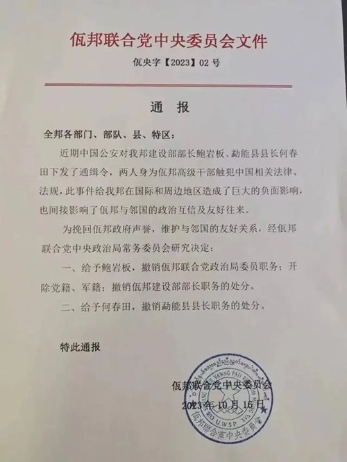 【缅北两官员遭中方通缉后被撤职】10月16日,缅甸佤邦联合党中央委员会发布通报,佤邦建设部部长鲍岩板、勐能县县长何春田触犯中国相关法律、法规,对鲍岩板撤销佤邦联合党政治局委员职务、开除党籍军籍、撤销佤邦建设部部长职务处分;对何春田撤销勐能县县长职务处分。