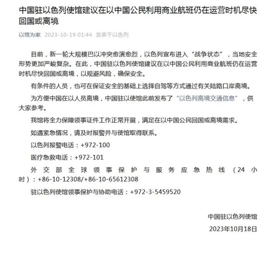 为方便中国在以人员离境,中国驻以使馆此前发布了“以色列离境交通信息”。中国驻以使馆将全力保障领事证件工作正常开展,满足在以中国公民回国或离境需求。
