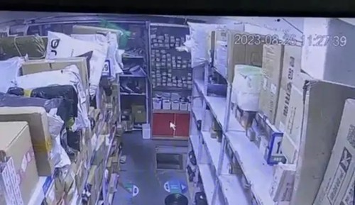 监控视频显示,在两列快递货架的拐角处,紧邻墙壁的地面上有一方形洞口,一位疑似店内工作人员将一小件快递从洞口投下后,一女子走过来并未留意到洞口,一脚踩空斜着身子跌落。