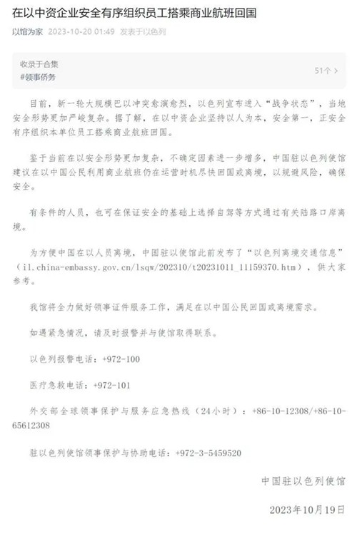 【中使馆:在以中企正组织员工回国】2023年10月19日,中国驻以色列使馆发布《在以中资企业安全有序组织员工搭乘商业航班回国》,全文如下: