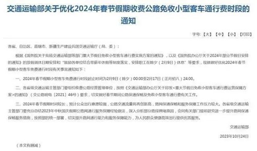 交通运输部关于优化2024年春节假期收费公路免收小型客车通行费时段的通知