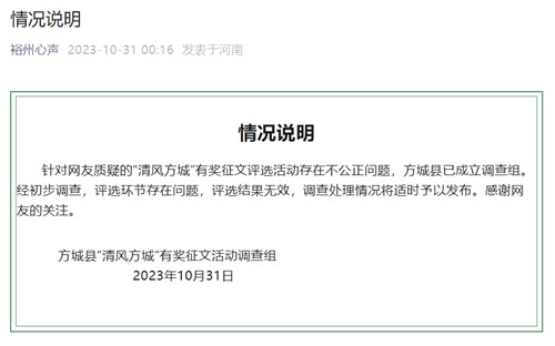 针对网友质疑的“清风方城”有奖征文评选活动存在不公正问题,河南南阳市方城县“清风方城”有奖征文活动调查组10月31日凌晨发布情况说明称,经初步调查,评选环节存在问题,评选结果无效,调查处理情况将适时予以发布。