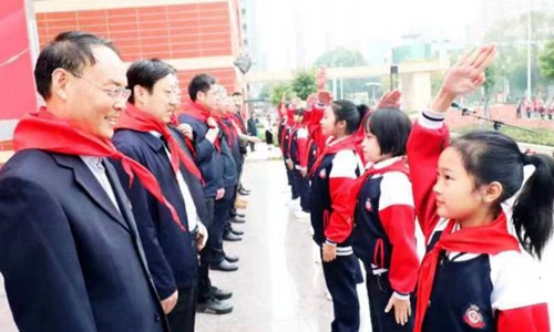 上午八时,伴随着雄壮嘹亮的国歌声,五星红旗冉冉升起,参加活动的2000多名同学高举右拳,目光炯炯。“心系国防,强国有我;心系国防、强国有我;心系国防、强国有我……”孩子们稚嫩但坚定无比的铿锵誓言响彻天空。
