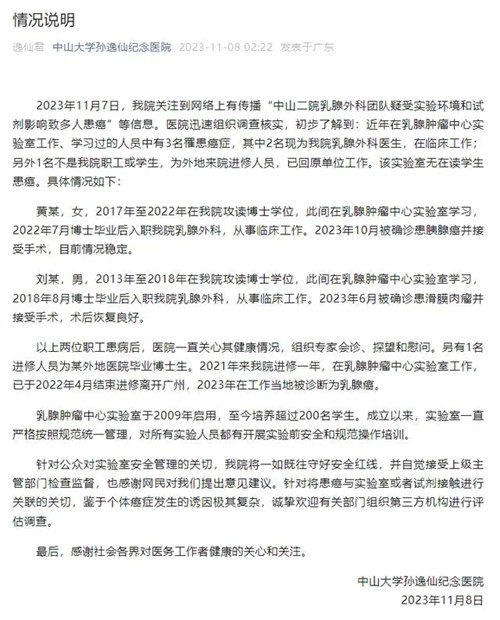 【医院回应涉癌实验室拆除:消防检查】对网传中山大学孙逸仙纪念医院(以下简称中山二院)一导师团队中有多名学生患癌事件,11月7日,中山二院深夜通报称,近年来在乳腺肿瘤中心实验室学习、工作过的人员中有3名在2023年先后被确诊癌症。
