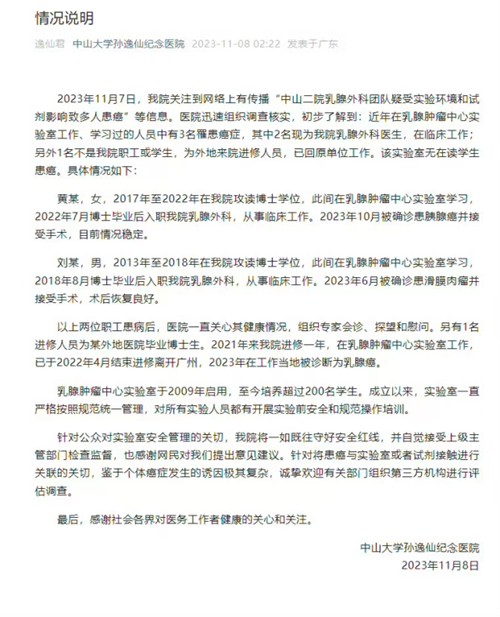 8日2点22分,中山二院发布官方回应称,近年在医院乳腺肿瘤中心实验室工作、学习过的人员中有3名罹患癌症,并于2023年先后确诊癌症,无在读学生患癌。院方还表示,鉴于个体癌症发生的诱因极其复杂,诚挚欢迎有关部门组织第三方机构进行评估调查。