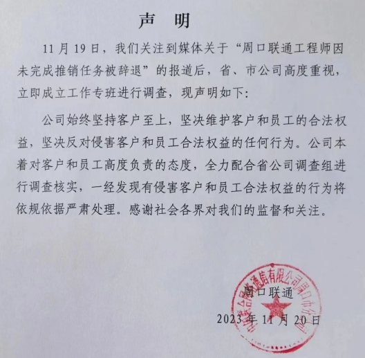 针对此事,11月20日,周口联通发布声明称,11月19日,公司关注到媒体关于“周口联通工程师因未完成推销任务被辞退”的报道后,省、市公司高度重视,立即成立工作专班进行调查。