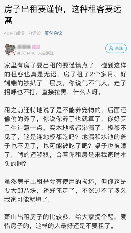 网友@往事谁疯:我遇到过一个租客,房间地板全是被烟头烫过的疤,门被踢坏,锁被撬,马桶盖破,水箱盖也是破的,进去感觉不像有人住的房子,真的会被气死。
