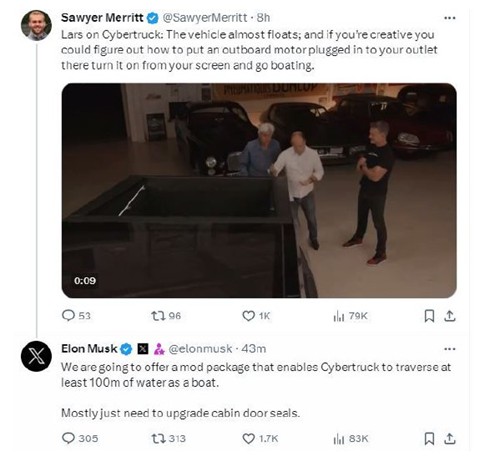 马斯克是在回应电动汽车分析师索耶·梅瑞特(Sawyer Merritt)转发的特斯拉车辆工程副总裁Lars Moravy与知名汽车收藏家Jay Leno的一段访谈视频时作这-表述。Moravy称Cybertruck几乎是可以漂浮的,如果你有创意的话,你可以想办法把一个舷外马达插到你的插座上,把它从屏幕上打开,然后当成船来使用。