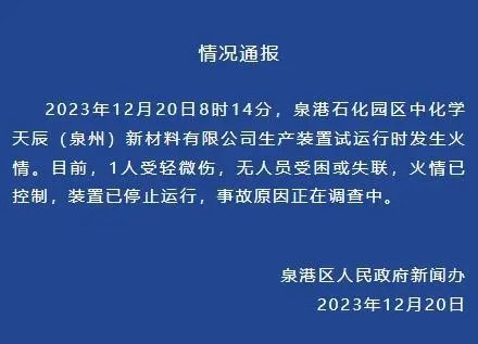 2023年12月20日8时14分,泉港石化园区中化学天辰(泉州)新材料有限公司生产装置试运行时发生火情。目前,1人受轻微伤,无人员受困或失联,火情已控制,装置已停止运行,事故原因正在调查中。