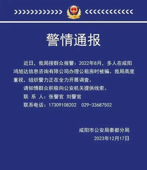 另据12月17日秦都区警方消息,2022年8月,多人在咸阳鸿旭达公司办理公租房时被骗,该局高度重视,组织警力正在全力开展调查,“请知情群众积极向公安机关提供线索”。