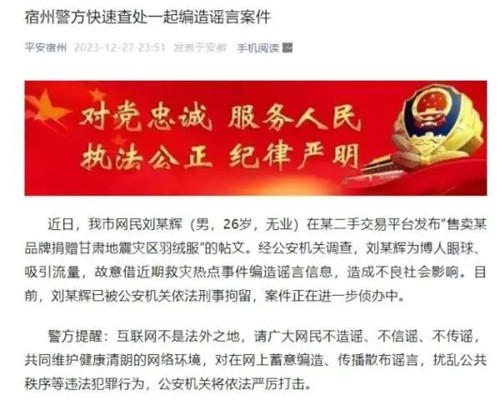 【捐赠震区羽绒服被倒卖系谣言】“平安宿州”微信公众号27日晚发布通报称,近日,安徽省宿州市网民刘某辉(男,26岁,无业)在某二手交易平台发布“售卖某品牌捐赠甘肃地震灾区羽绒服”的帖文。经公安机关调查,刘某辉为博人眼球、吸引流量,故意借近期救灾热点事件编造谣言信息,造成不良社会影响。目前,刘某辉已被公安机关依法刑事拘留,案件正在进一步侦办中。
