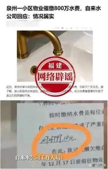 经泉州相关部门核实,网传文章不实,事发地实为天津。经福建辟谣平台排查发现,有媒体报道,12月11日晚间,#物业回应小区业主欠水费800余万元#的词条就曾登上微博热搜榜,相关事件事发地为天津市东丽区华明街道福煦广场小区。造谣者通过对热点事件的相关信息进行搬运改造,炮制谣言。