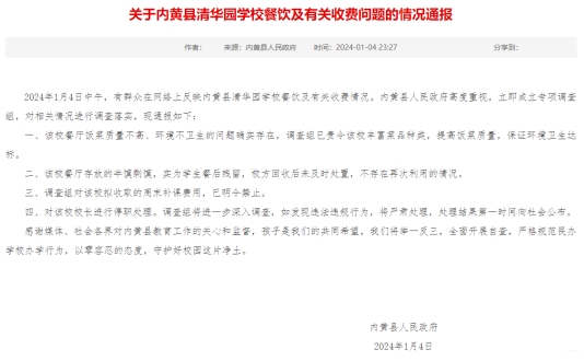 针对此事,内黄县人民政府1月4日晚发布关于内黄县清华园学校餐饮及有关收费问题的情况通报。通报显示: