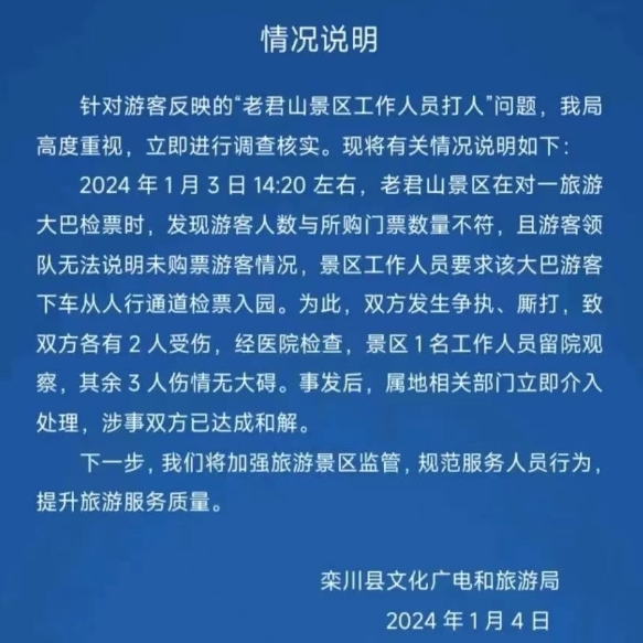 据栾川县文化广电和旅游局针对游客反映的“老君山景区工作人员打人”问题发布的情况通报显示,2024年1月3日14:20左右,老君山景区在对一旅游大巴检票时,发现游客人数与所购门票数量不符,且游客领队无法说明未购票游客情况,景区工作人员要求该大巴游客下车从人行通道检票入园。