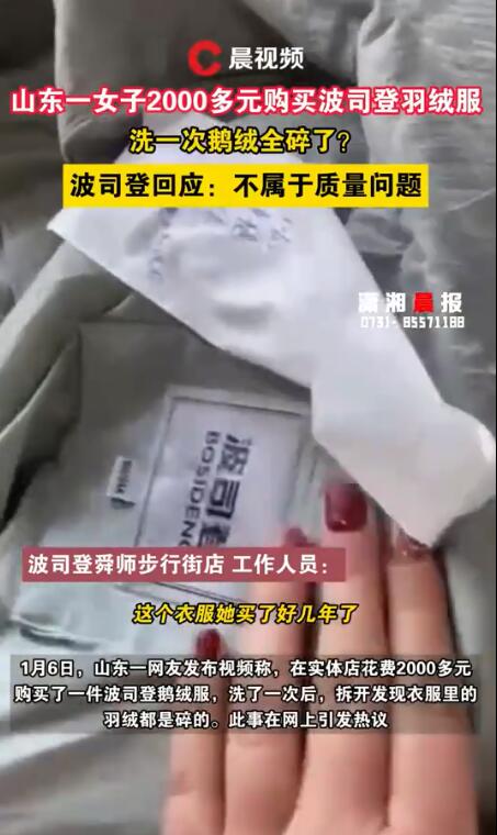 1月8日下午,记者联系到波司登舜师步行街店,一名工作人员表示,该女子曾拿着羽绒服来到门店维权。“她说是从我们门店买的,但是拿不出购物小票。而且这是好几年前的款式,我们门店这两年都没有卖过这一款。而且这款当时是打了一个很低的折扣,没有那么贵。”该工作人员称,“她已经将衣服寄给了公司的售后服务部,得到的回复是不属于质量问题,是她的不当清洗造成的。如果她觉得是质量问题可以鉴定。”(来源:潇湘晨报)