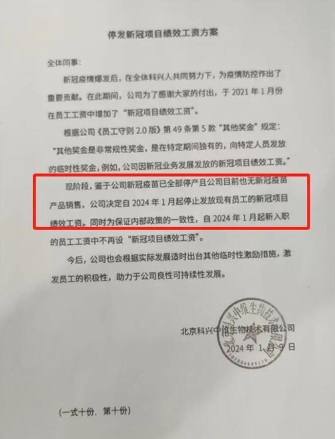 记者注意到,上述方案的落款时间为1月9日,并盖有北京科兴中维生物技术公司的公章,其中提到,现阶段,公司新冠疫苗已全部停产且公司目前也无新冠疫苗产品销售,公司决定自2024年1月起停止发放现有员工的新冠项目绩效工资。