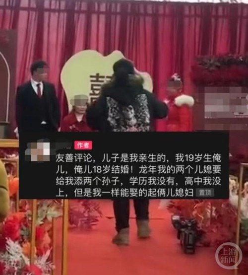 1月22日,上游新闻记者联系上刘女士。她表示,自己的确是37岁,有两个孩子,办喜酒的是大儿子。对于网友们质疑的“儿子儿媳是否已登记领证”,她只表示:“儿媳比儿子大,儿媳已经到了可以办结婚证的年龄了。”