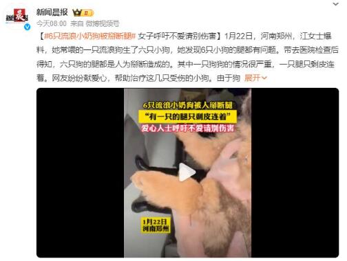 【6只刚出生狗仔被人掰断腿骨】1月22日,河南郑州,江女士爆料,她常喂的一只流浪狗生了六只小狗,她发现6只小狗的腿都有问题。带去医院检查后得知,六只狗的腿都是人为掰断造成的。其中一只狗狗的情况很严重,一只腿只剩皮连着。
