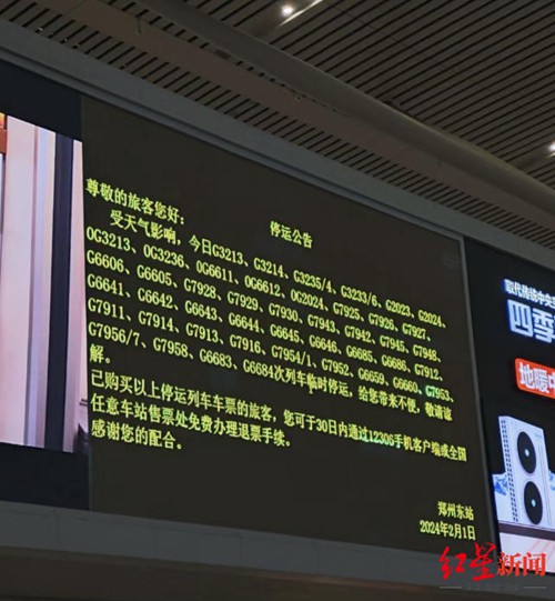 据国铁郑州局集团公司通报,受中东部地区大范围雨雪冰冻天气影响,为确保旅客列车运行安全和旅客出行安全,对部分线路区段列车采取降速、动态抽线运行等措施。据河南交通广播,2月1日郑太、郑西等高铁区段有24.5对列车停运。为保障旅客在低温雨雪天气中温暖出行,即日起至2月5日,国铁集团郑州局管内高铁、普速各站候车室24小时开放,并加强车站照明、供暖、饮用水、卫生间、保洁等设备设施运维,组织候车室商铺保障餐饮供应。