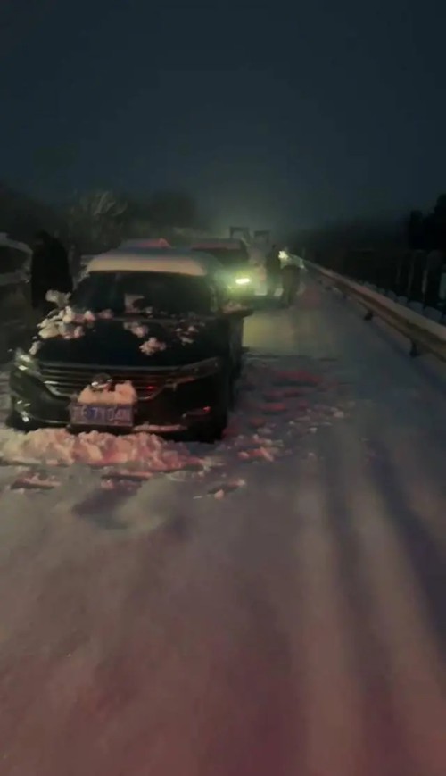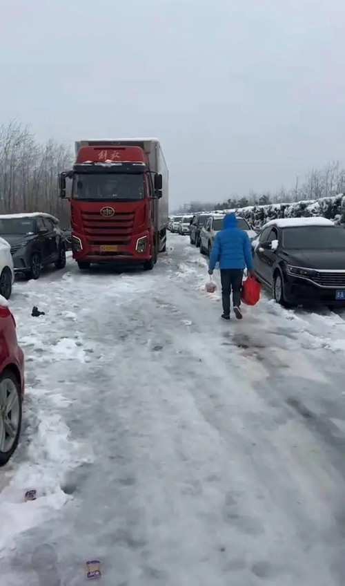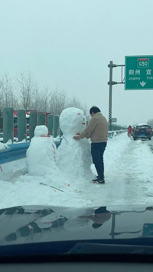 他说,在下车买食物之前,一公里要花一个小时,后来好几个小时不动,他才敢离开车子。“不敢一直待在车里开空调,怕没油了车子趴窝。下车活动活动,一路上不知道堆了多少雪人,都是一人多高的雪人。冻得受不了,才重启车子暖和一会儿。有些路段打滑,还要推一段开一段。”