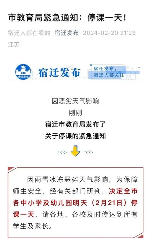 宿迁通知21日停课一天:宿迁各中小学及幼儿园明天(2月21日)停课一天。