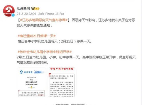 【江苏多地因恶劣天气宣布停课】因恶劣天气影响,江苏多地发布关于应对恶劣天气停课的紧急通知: