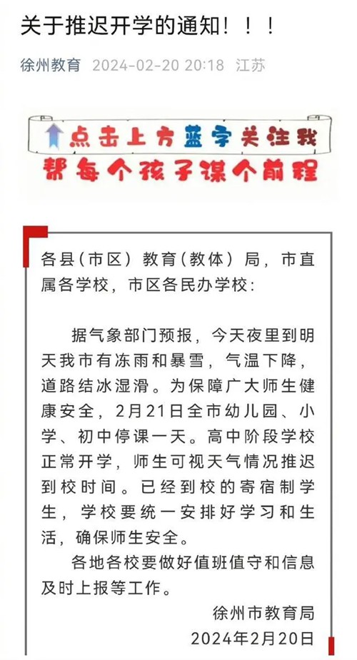 徐州全市幼儿园小学初中延迟开学:2月21日全市幼儿园、小学、初中停课一天。高中阶段学校正常开学,师生可视天气情况推迟到校时间。