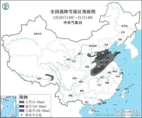 中央气象台20日18时继续发布暴雪黄色预警:预计20日20时至21日20时,山东、河南、安徽北部、江苏北部、湖北西部、河北南部、山西中南部、陕西北部、西藏西南部和东部等地部分地区有大到暴雪,其中,山东西北部和南部、河南南部等地局地有大暴雪。上述部分地区新增积雪深度3~8厘米,局地可达12厘米以上。