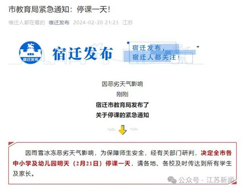 据气象部门预报,今天夜里到明天我市有冻雨和暴雪气温下降,道路结冰湿滑。为保障广大师生健康安全,2月21日全市幼儿园、小学、初中停课一天。高中阶段学校正常开学,师生可视天气情况推迟到校时间。已经到校的寄宿制学生,学校要统一安排好学习和生活,确保师生安全。