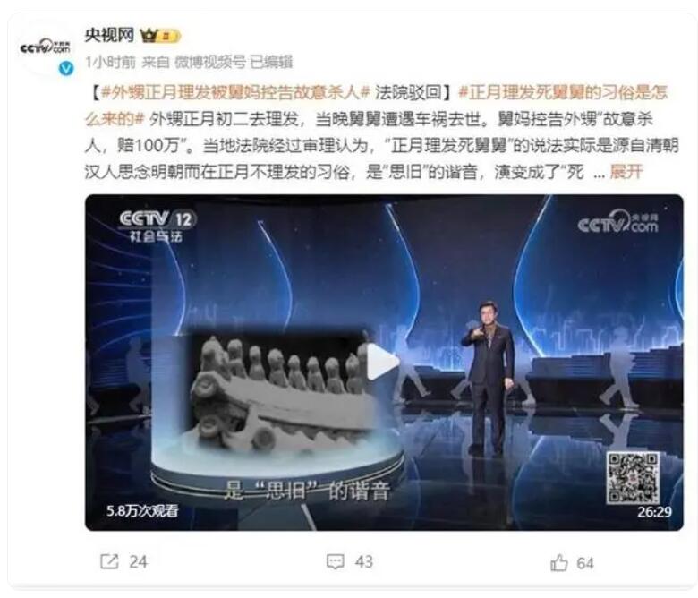 【外甥正月理发舅舅去世 舅妈控告杀人】据央视网报道,2月21日,CCTV12社会与法频道《年关说案》播出一则案例:外甥正月初二去理发,当晚舅舅遭遇车祸去世。舅妈控告外甥“故意杀人,赔100万”。当地法院经过审理认为,民间习俗不能上升到道德层面绑架人。最终,法院依法驳回了原告舅妈的诉讼请求。
