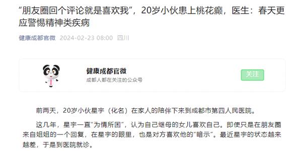 【20岁小伙患上“桃花癫” 医生提醒】2月23日消息,春暖花开,万象更新,又到了生机勃勃的季节,但春天也是多种心理精神疾病爆发的季节,需要小心应对。