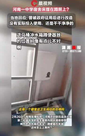 【中学宿舍床下是蹲便器床头是冲水箱】2月26日,有网友爆料称,河南开封尉氏县永兴镇第二初级中学的学生宿舍内部环境很奇怪,厕所的冲水箱在床头,蹲便器在床底。