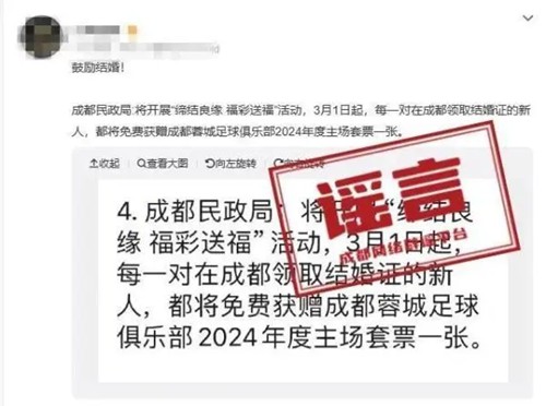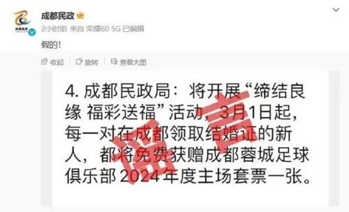 【成都领结婚证送足球套票?】近日,有本地网民发帖称,成都民政局将开展“缔结良缘福彩送福”活动,内容为“3月1日起,每一对在成都领取结婚证的新人,都将免费获赠成都蓉城足球俱乐部2024年度主场套票一张。”