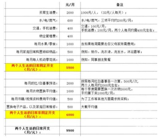 女生解释,9900元的生活开支,仅仅是两人生活的月平均固定开支,此外还有部分非固定支出没有计算在内,例如两人或者双方父母生病、孩子上学后的一些培养开支等。