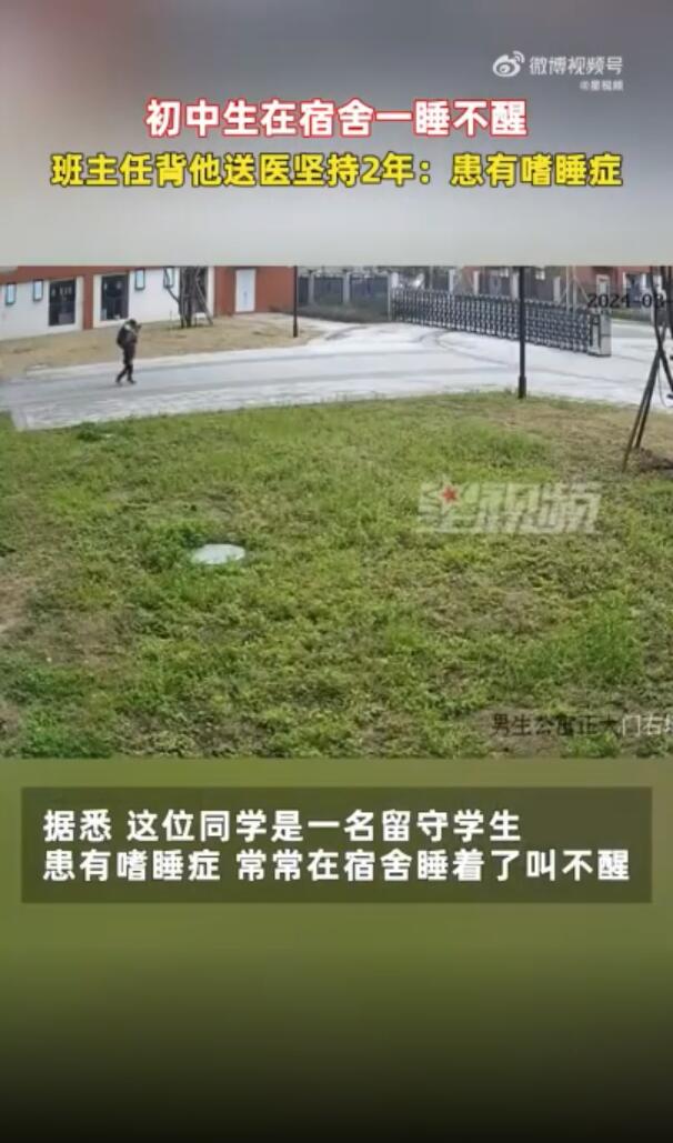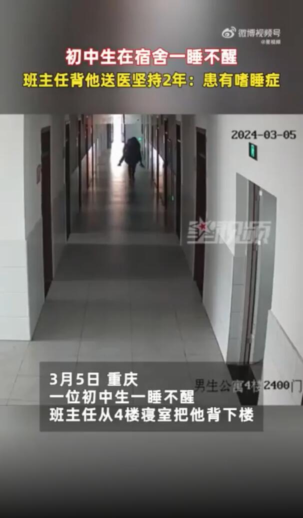 据悉,这位同学是一名留守学生,患有嗜睡症,常常在宿舍睡着了叫不醒,从初一到初二,两年来每次都是班主任背着他送医或者送回家休息。