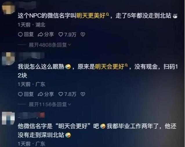 近15万条评论中,不少大爷的“熟人”现身。有网友指出,这个大爷微信名是“明天会更好”,而他们也遇到过大爷,手里没现金,就直接给大爷转账,少的转了10元、20元,多的转了200元。有网友直言,“这个NPC走了5年,都没走到深圳北站。”“周十三”告诉记者,自己还收到四五条私信,“都是讲述自己被这位大爷行骗的过程,用同样的话术、在同样的场景。”