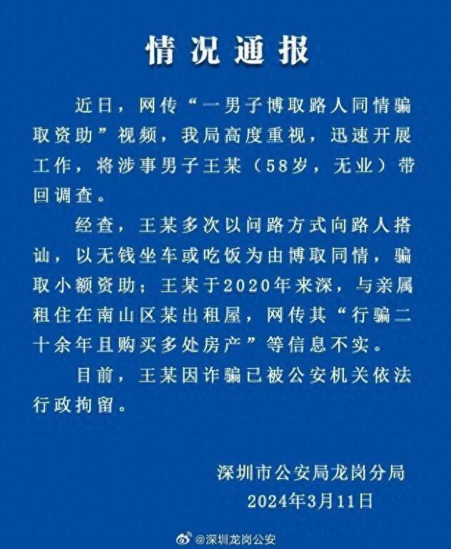 近日,网传“一男子博取路人同情骗取资助”视频,我局高度重视,迅速开展工作,将涉事男子王某(58岁,无业)带回调查。经查,王某多次以问路方式向路人搭讪,以无钱坐车或吃饭为由博取同情,骗取小额资助;王某于2020年来深,与亲属租住在南山区某出租屋,网传其“行骗二十余年且购买多处房产”等信息不实。
