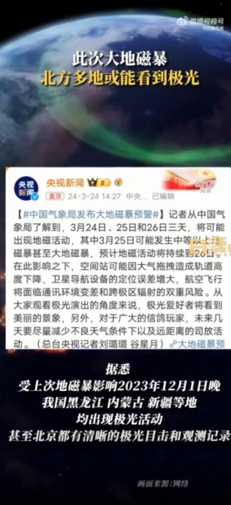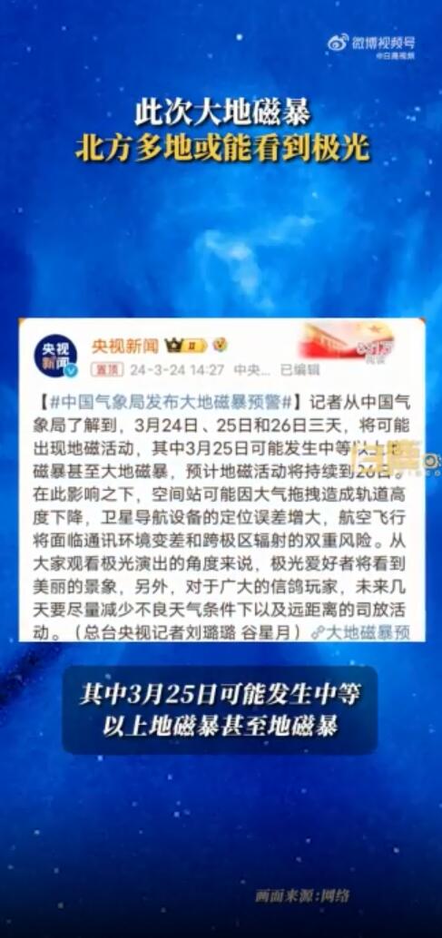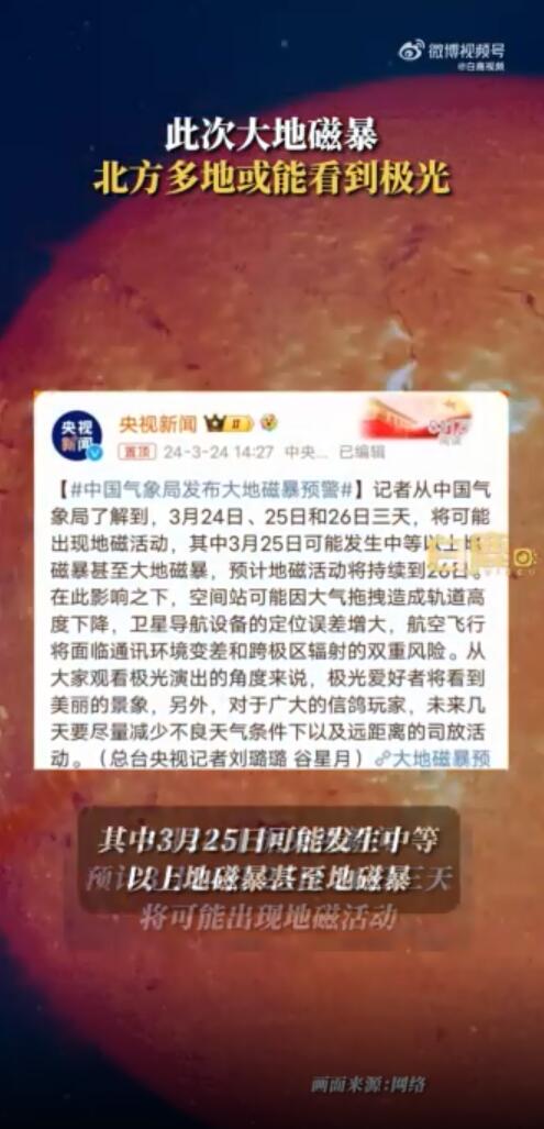 【大地磁暴北方多地或能看到极光】3月24日,据央视新闻,预计3月24日、25日、26日三天,将可能出现地磁活动,其中3月25日可能发生中等以上地磁暴甚至大地磁暴。