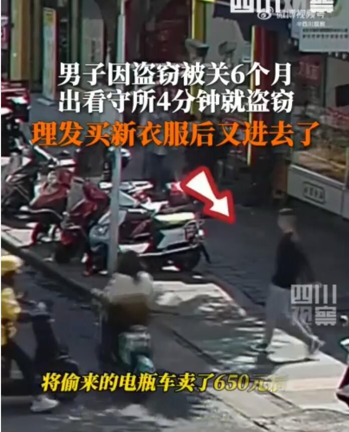 3月27日,一男子因盗窃被判6个月,最近到了放还的时间。8点50分的时候杨某从看守所里走出来,8点54在看守所附近偷了一辆电瓶车扬长而去,将偷来的电瓶车卖了650元之后,消费换了一身新衣服。中午11点的时候警察再次将其抓获。
